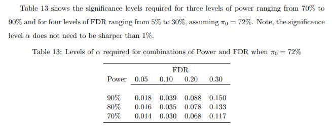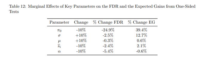 Table 12 lists out the model parameters in a sensitivity analysis for their analysis of FDR, and you can see that the “easy” levers discussed already have pretty small (but noticeable) effects on FDR.